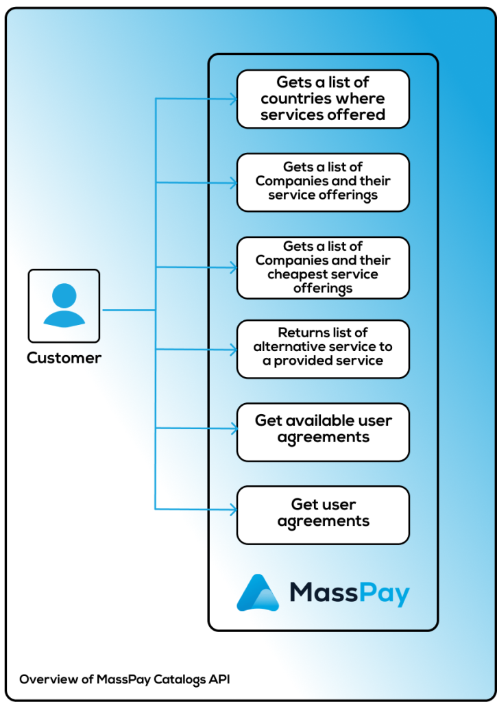 The MassPay Catalogs API provides a set of RESTful endpoints that enable you to retrieve useful information about the services available from MassPay. With the Catalogs API, you can get a list of countries where services are offered, along with the list of MassPay Global Partners and their service offerings for a particular country code. Furthermore, you can retrieve a list of alternative services to a provided service, and also obtain user agreements for the services offered.